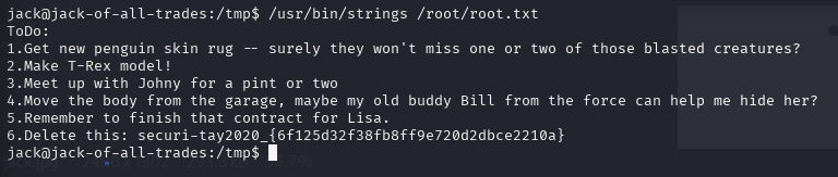 So does that mean I can just use strings to read the root/root.txt? Let’s find out (Spoilers the answer is yes.)