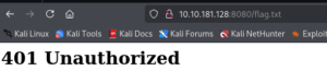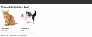 Heading to the website on port 8080 we are greeted with a very simple webpage. Two images of cat stikcers for sale and a home button and a feedback button. heading to /flag.txt we were greeted with a 401 Unauthorized not a big shock there.